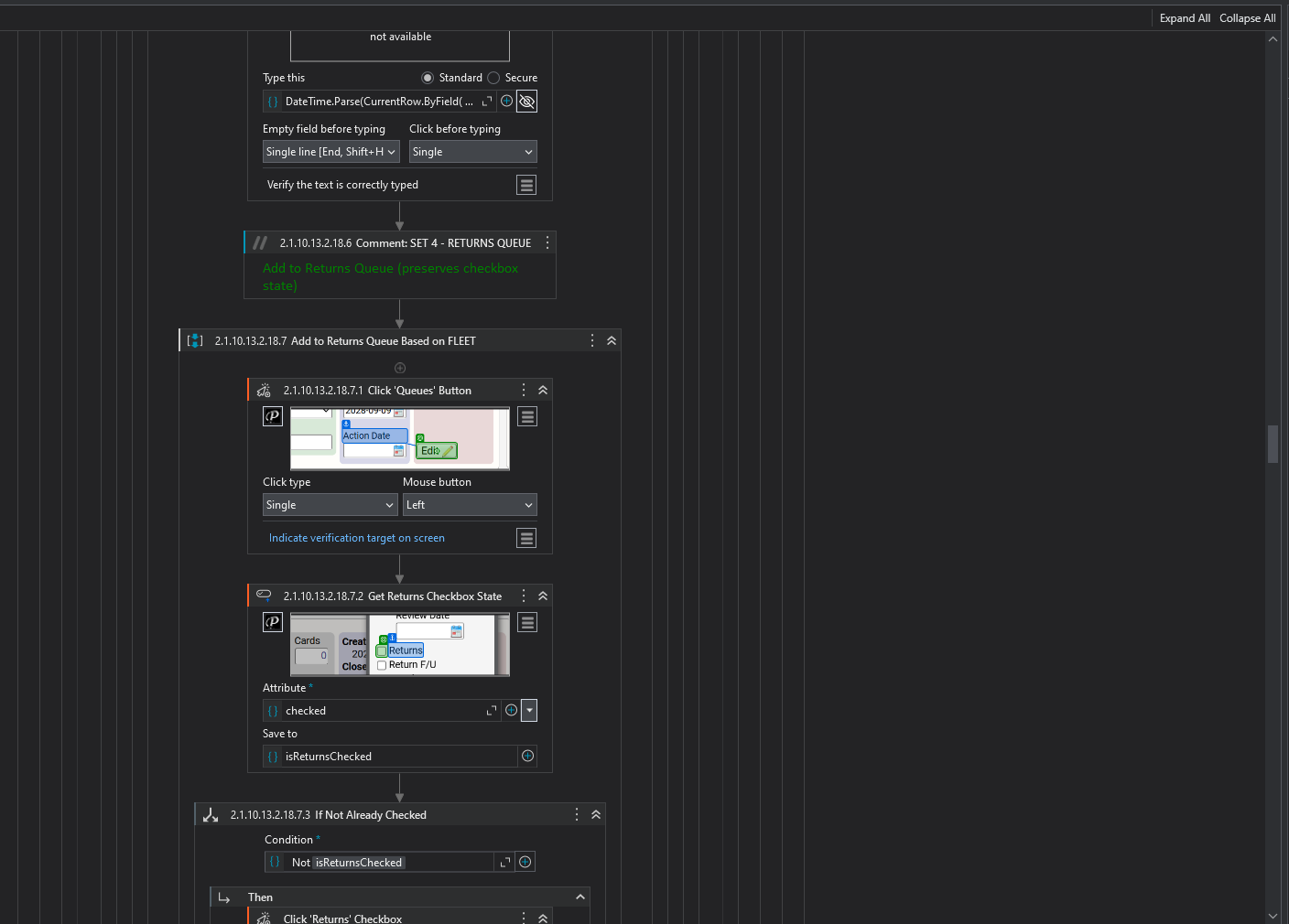 Operations team processing returned payments for fleet card accounts. Manual process required navigating a web portal to update account statuses, modify fields, and assign accounts to queues across multiple scenarios. Each account took 5-10 minutes, repeated hundreds of times daily.